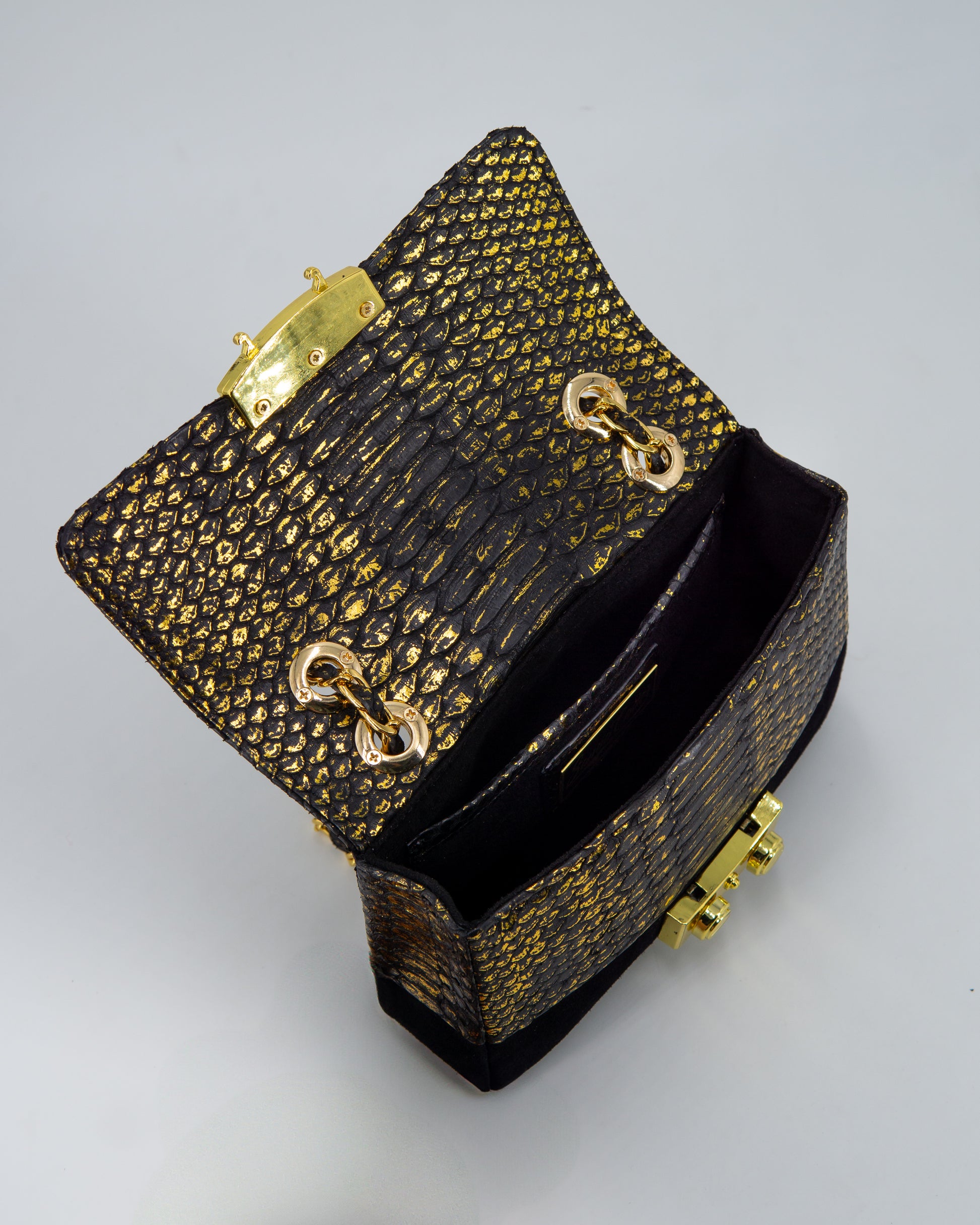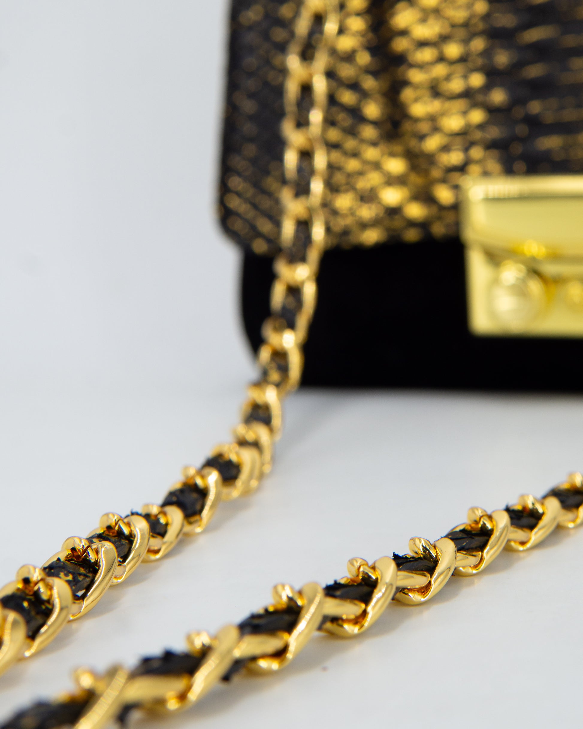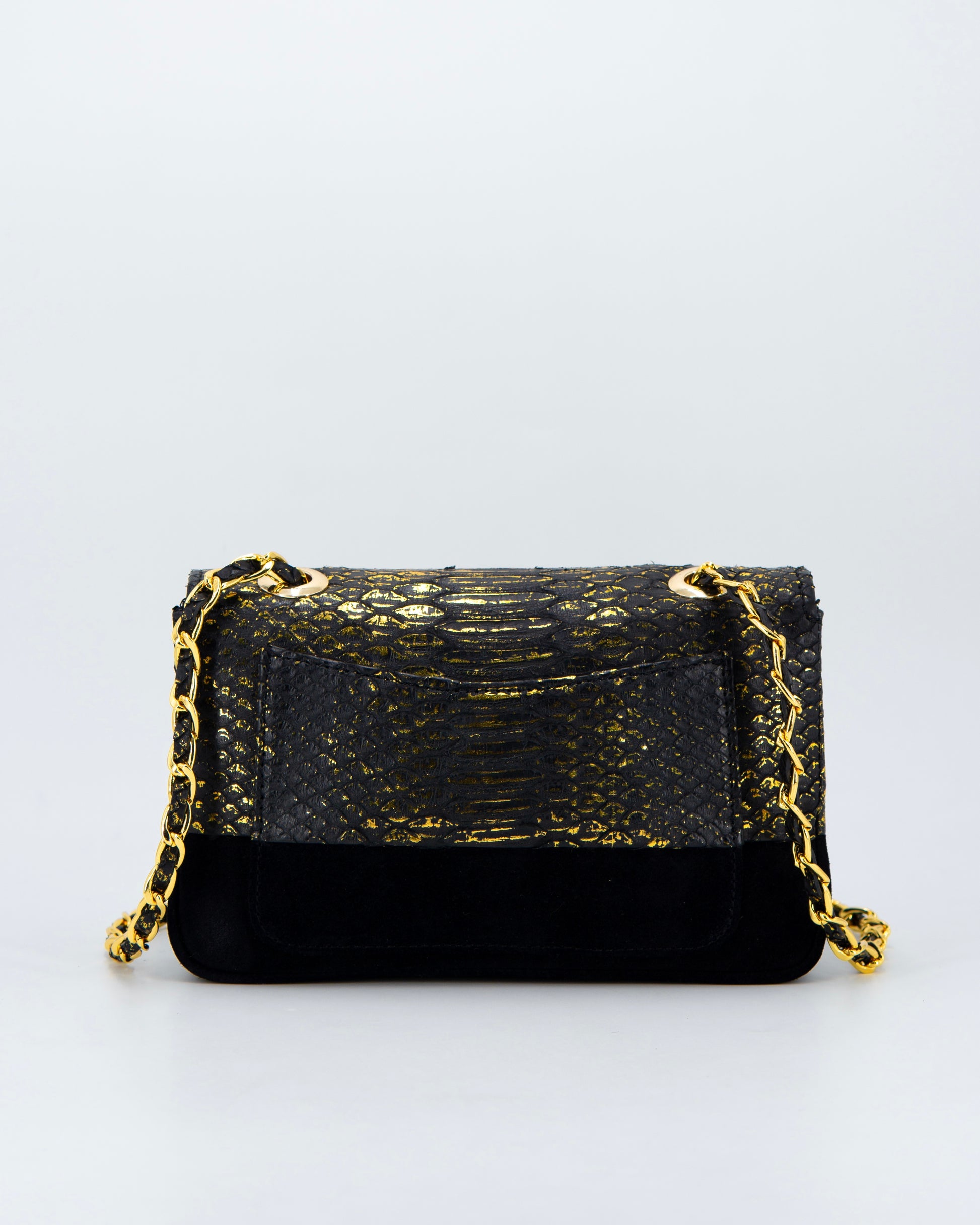 Elevate your style with the unique Noir Luxe Python, a stunning fusion of exotic elegance and timeless sophistication. Crafted from genuine python leather, its rich black hue is accented with a subtle golden sheen, creating a striking texture that exudes luxury. The bottom half of the bag is wrapped in smooth black suede, adding a refined contrast to the bold python pattern. Finished with a polished gold-tone clasp and a chain-link strap interwoven with leather, this statement piece is perfect for evening affairs or upscale day outings.
